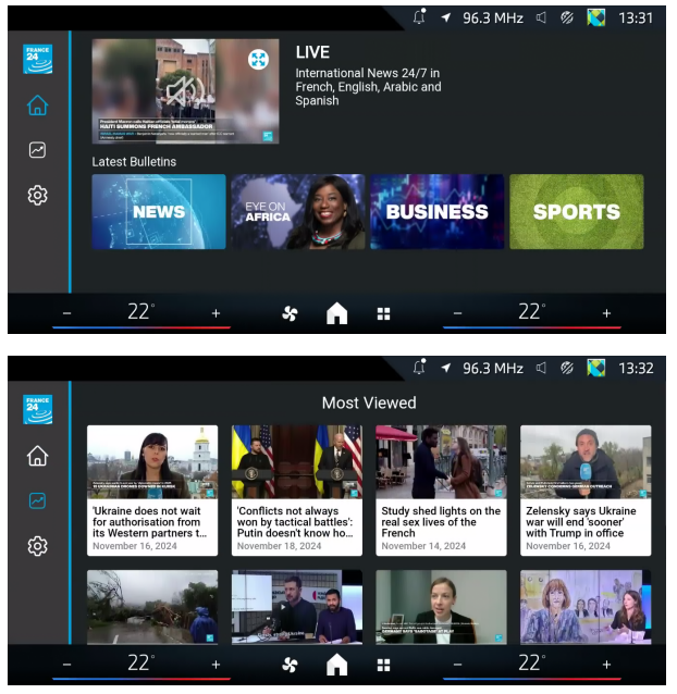 L’application de France 24 a été « entièrement pensée » pour un usage en voiture : l’interface tactile donne accès « en quelques gestes » aux contenus de France 24 dans ses quatre langues de diffusion (français, anglais, arabe, espagnol). Au démarrage, l’utilisateur accède à l’écran d’accueil présentant le direct de la chaîne, les derniers bulletins vidéo, ainsi qu’un menu vertical « simplifié » comprenant trois rubriques (accueil, les plus vus, paramètres). Les contenus peuvent être visionnés en plein écran, les langues changées instantanément.