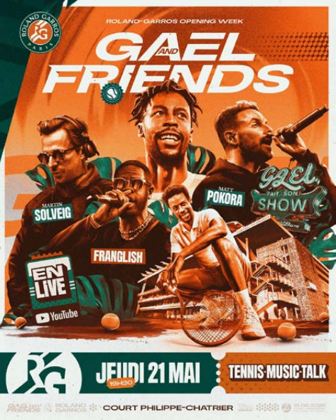 Sur le mythique court Philippe-Chatrier, le chanteur Matt Pokora et l’humoriste Paul de Saint-Sernin officieront en maîtres de cérémonie pour ce format intitulé « Gaël and Friends ». Parmi les personnalités conviées par Gaël Monfils pour participer à ce show : le DJ Martin Solveig, le rappeur et danseur Franglish ainsi que « des grands noms du tennis français et international », sans autre précision. Cette soirée caritative, conçue pour être « festive et fun », sera ponctuée de séquences interactives et « nombreuses surprises », est-il indiqué.