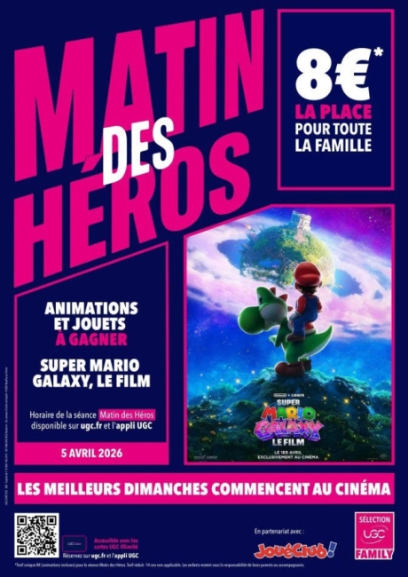 UGC lance un nouveau rendez-vous familial, intitulé « Le Matin des héros », qui aura lieu le dimanche matin dans 16 de ses cinémas avec des animations et activités dédiées aux enfants 45 minutes avant la projection d’un film, pour un tarif unique de 8 euros, a annoncé la société, mardi 24 mars. La première édition aura lieu le dimanche 5 avril, à l’occasion de la sortie du film d’animation Super Mario Galaxy, le film.