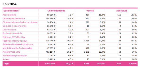 Le nombre d’acheteurs étrangers a atteint 900, avec Disney+ (Etats-Unis) à nouveau en première place, devant Movistar+ (Espagne) et Shorts International (Royaume-Uni). L’animation a représenté plus de 60 % du chiffre d’affaires global, tandis que les plateformes VOD ont totalisé près de 40 % du chiffre d’affaires. L’Amérique du Nord était la première zone géographique, et les Etats-Unis le premier pays.