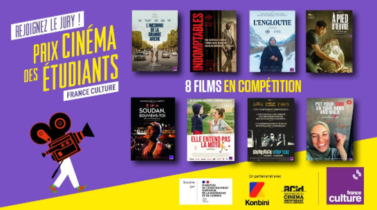 France Culture a dévoilé, lundi 16 mars, la liste des huit films en lice pour l’édition 2026 de ses prix Cinéma des étudiants, qui seront remis à l’occasion du Festival de Cannes. Les films en compétition dans la catégorie fiction, en partenariat avec Konbini, sont L’Inconnu de la Grande Arche de Stéphane Demoustier, Indomptables de Thomas Ngijol, L’Engloutie de Louise Hémon, A pied d’œuvre de Valérie Donzelli. Par ailleurs, quatre documentaires, dont deux soutenus par l’Acid, sont en lice : Soudan, souviens-toi de Hind Meddeb, Put Your Soul on Your Hand and Walk de Sepideh Farsi, Soundtrack to a Coup d'Etat de Johan Grimonprez, et Elle entend pas la moto de Dominique Fischbach.