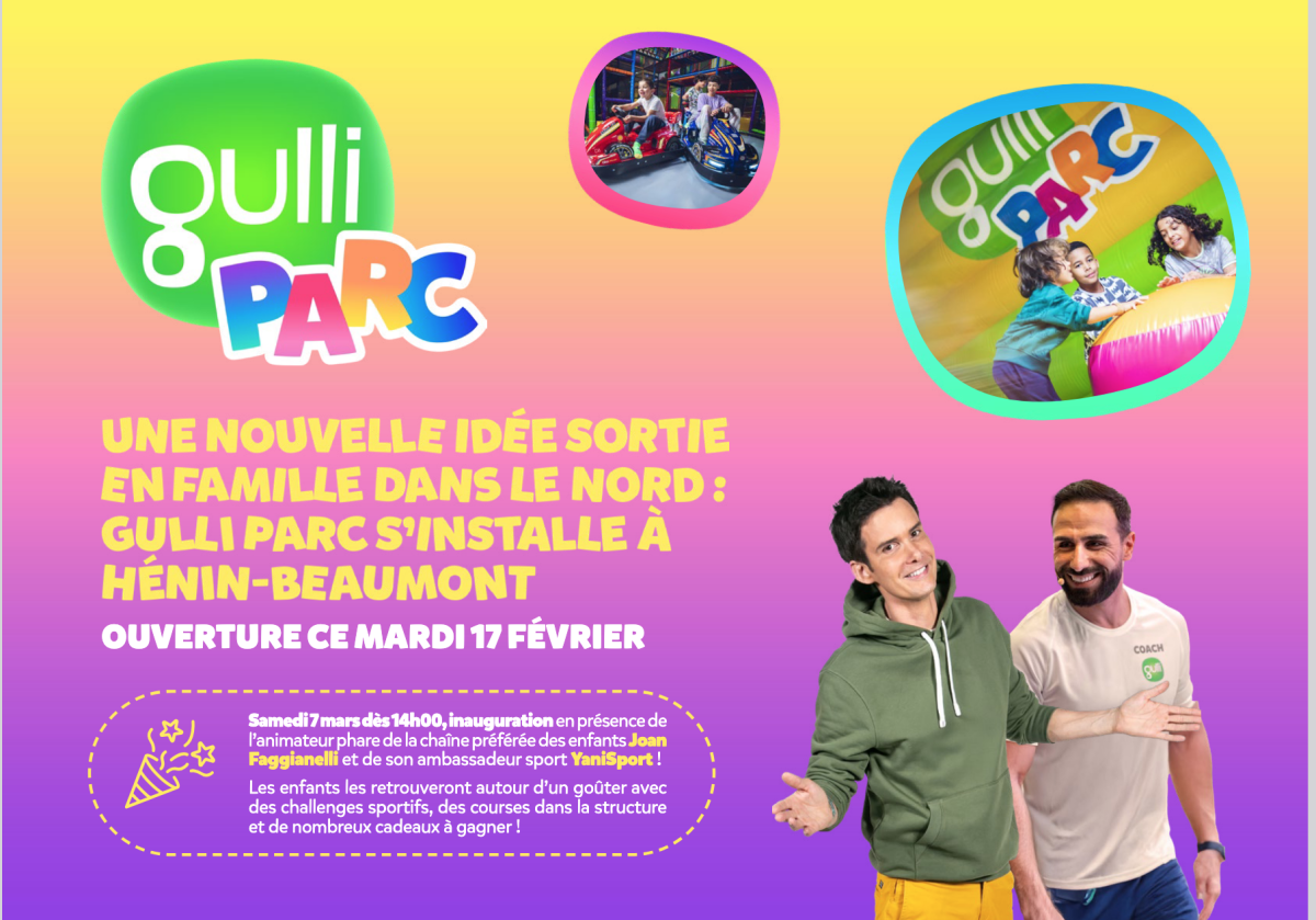 Gulli et La Boîte aux enfants (groupe M6) ouvriront mardi 17 février à Hénin-Beaumont, dans le Pas-de-Calais, leur dix-septième Gulli Parc, a annoncé la chaîne vendredi 13 février. Le site sera inauguré le 7 mars en présence de l’animateur et producteur Joan Faggianelli et du coach sportif YaniSport.